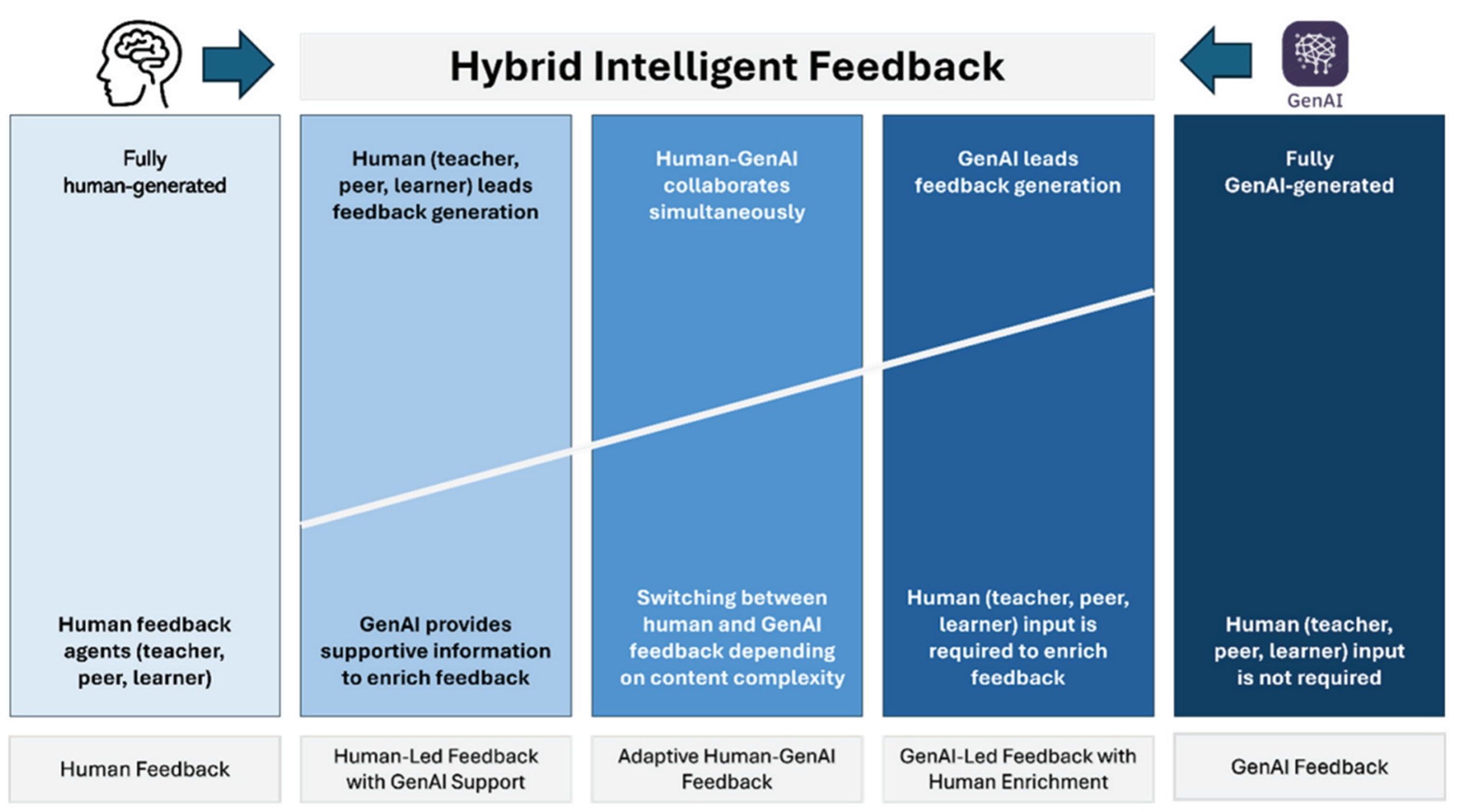 Hybrid intelligent approaches take different forms, ranging from human-led feedback with GenAI to GenAI-led feedback with human enrichment (see Figure 2).