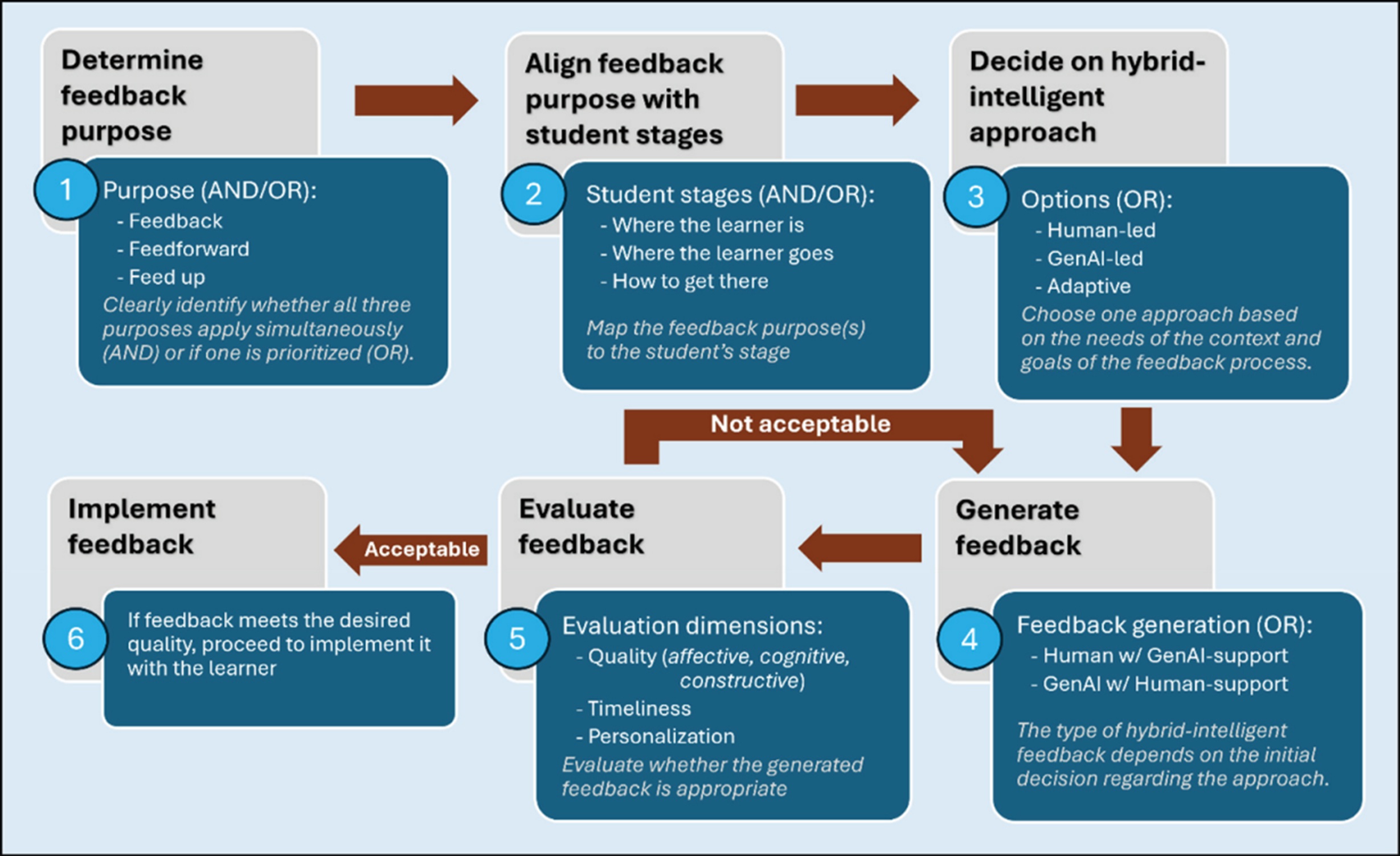The six steps below provide a structured approach to implementing hybrid feedback in practice. A critical point is choosing the right approach (step 3). This is highly context-dependent.
